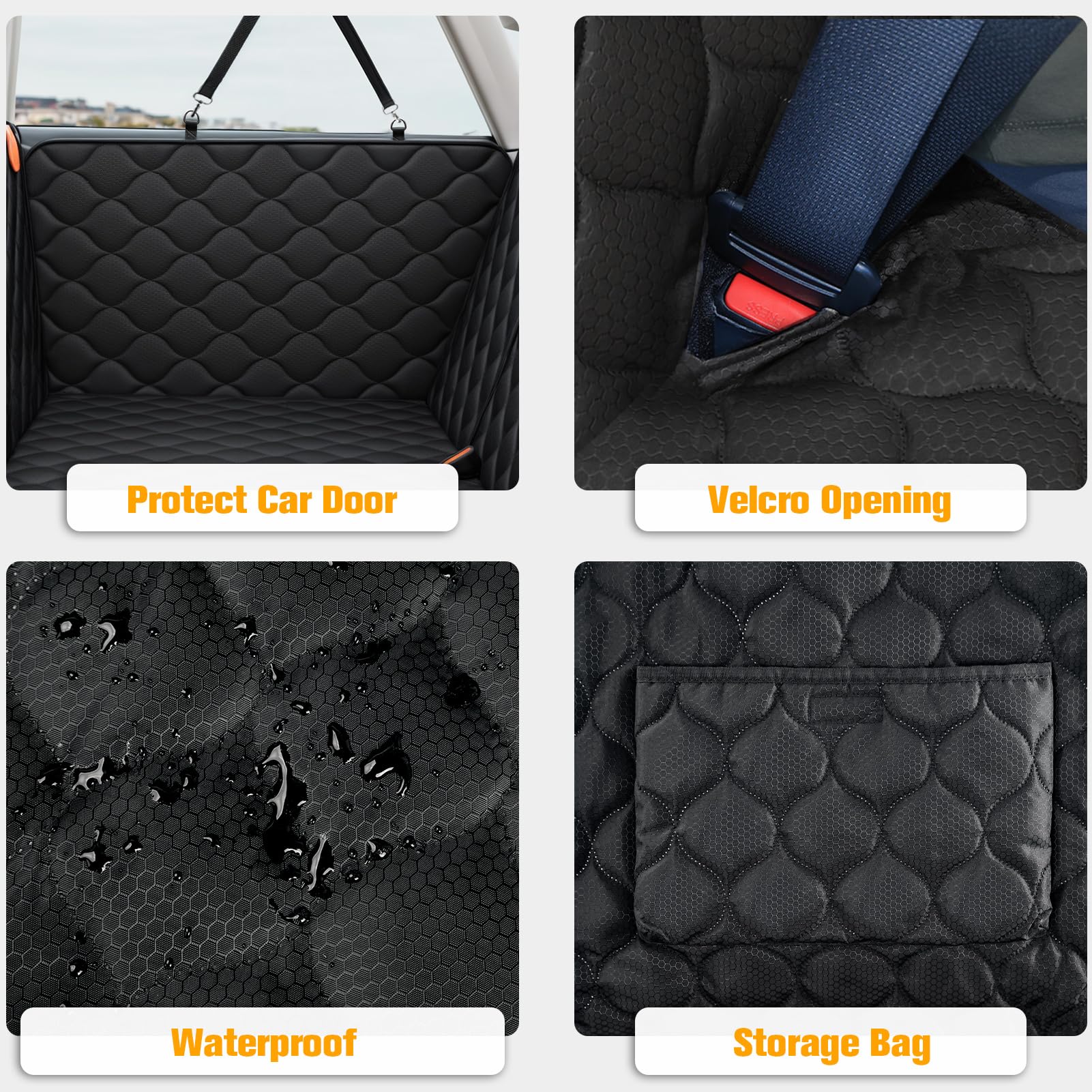 Upgraded with a 6-layer structure, the upper layer of the dog car seat cover is made of a water-resistant coating with hot pressing technology, without needle holes to avoid leaking water, keeping your back seat safe from scratches, fur, urine, food, and juice spills. The bottom layer is Non-slip Rubber Backing, no worries about quick turns and speed bumps.