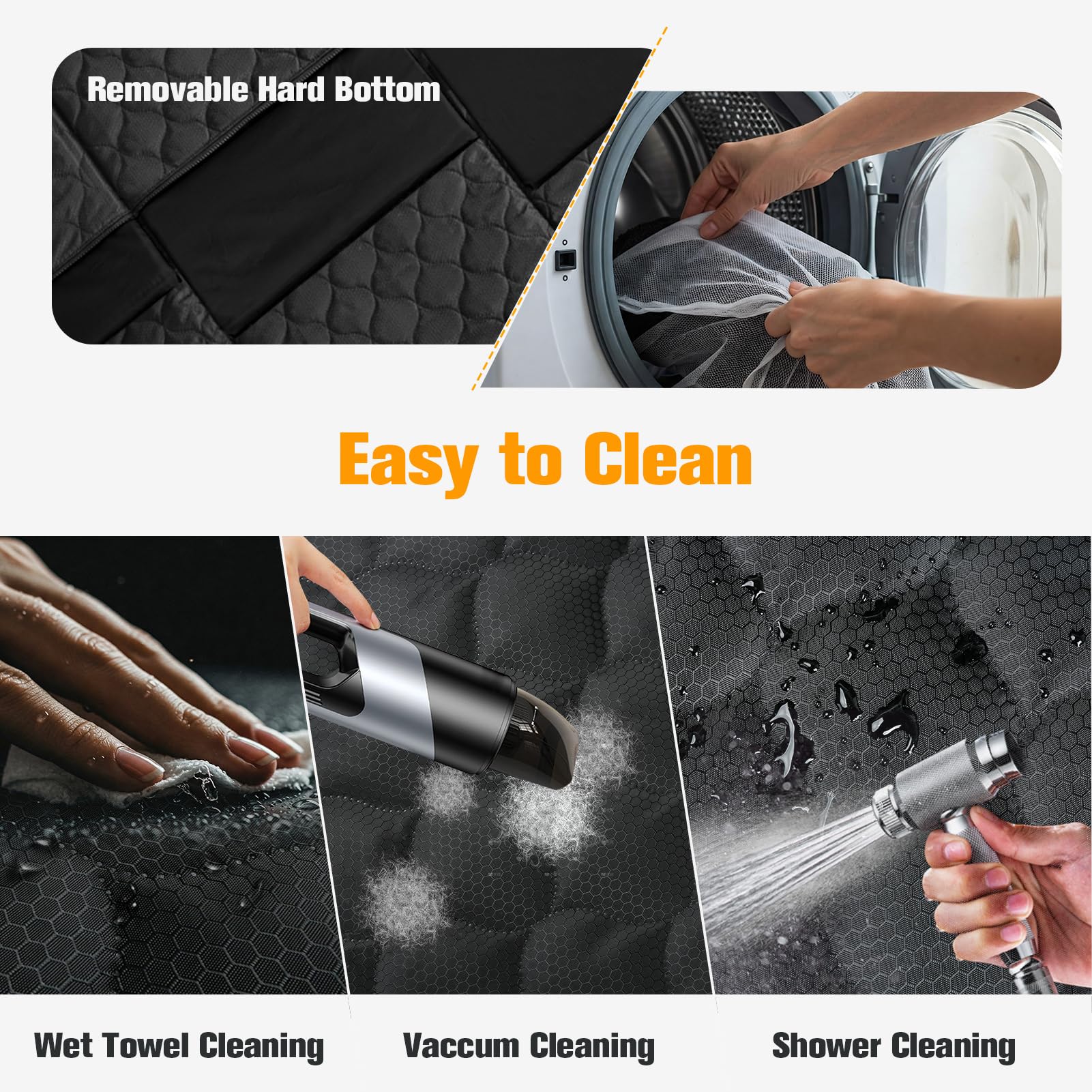 The hard bottom boards and durable zippered side flaps offer comprehensive protection, preventing your dog from falling into the footwell when the sudden brake and turn, while also safeguarding the car doors. And all the hair and dirt will remain on the surface of the car seat covers, making it easy to clean with a damp cloth, vacuum, or shower.