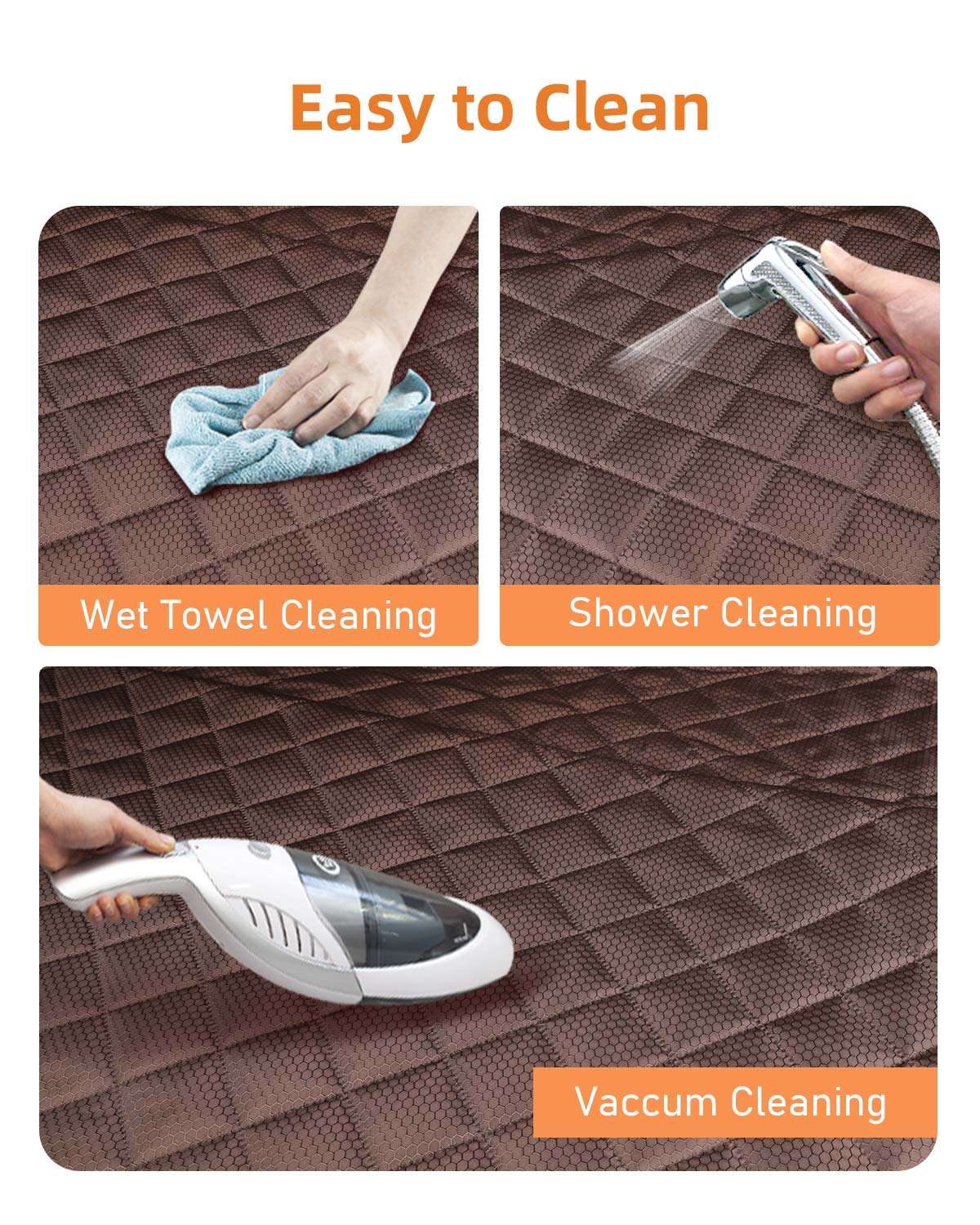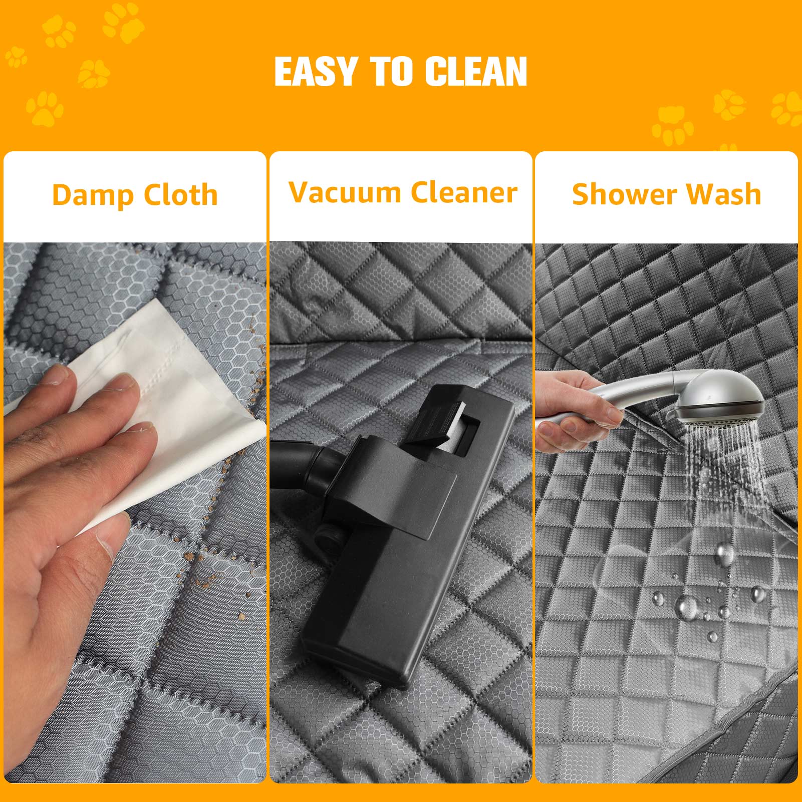 4 waterproof layers quilted, durable 600D Oxford fabric, the dog seat cover mat protects your car seat from scratches, pet dander, hair, spills, odors, mud, and water; Easy to clean just by wiping away dirt or vacuuming, washing by hand will be better