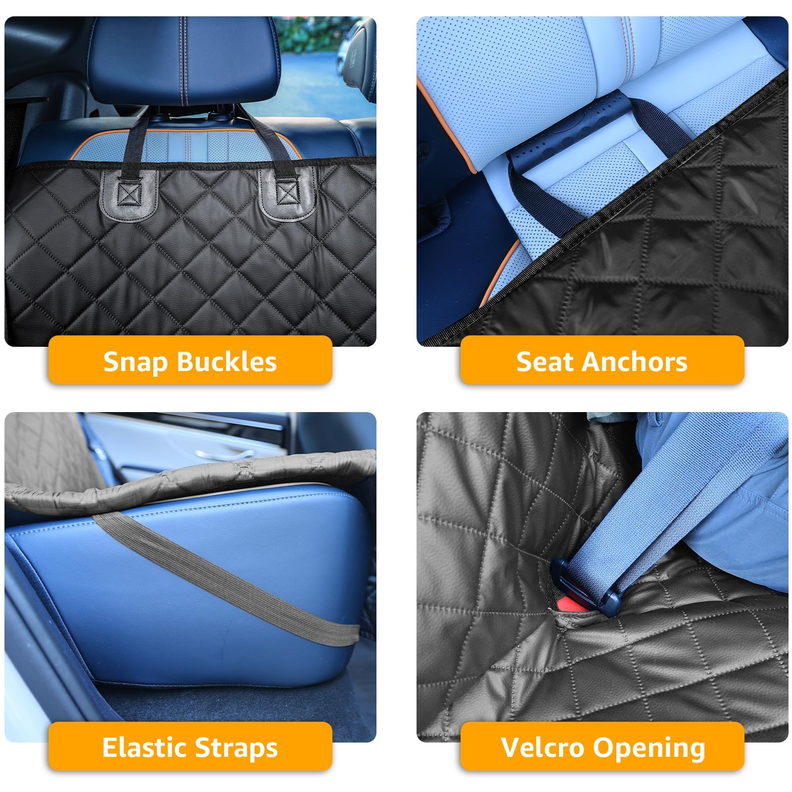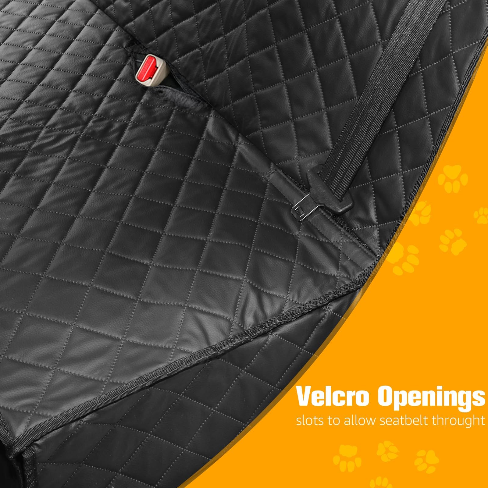 There are 4 velcro openings designed for seat belts. When you install the dog car seat cover for your backseat, you can fasten seat belts as usual, and you can also put the baby car seat as usual. The non-slip backing and adjustable straps keep the seat cover securely in place to prevent sliding.